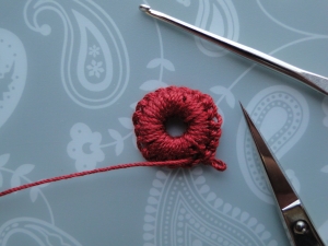 7 ch joined to make a ring. 12 sc (UK dc) into the ring and joined with a ss.Round 2: Do not work a chain. Work sc (UK dc) over the stitches of the first round, working into the center of the ring as before. Work over your tail end again.