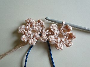 (Ch 3, sc into 2nd ch from hook, ch 1, ss into ring) 5 times;