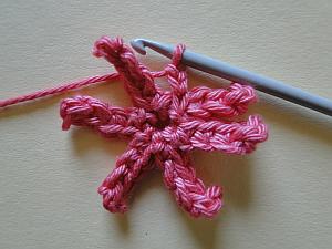 1st petal finished and ready to work 3 chain between 2nd and 3rd legsThe next five petals: